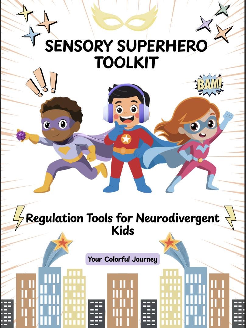 Sensory regulation tools for kids who struggle with noise, crowds, bright lights, transitions, or overwhelming environments. This child-friendly Sensory Superhero Toolkit turns complex sensory concepts into visual worksheets children can understand and use immediately.